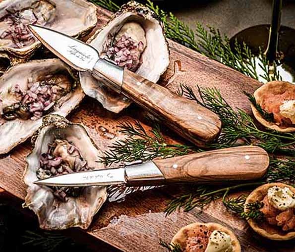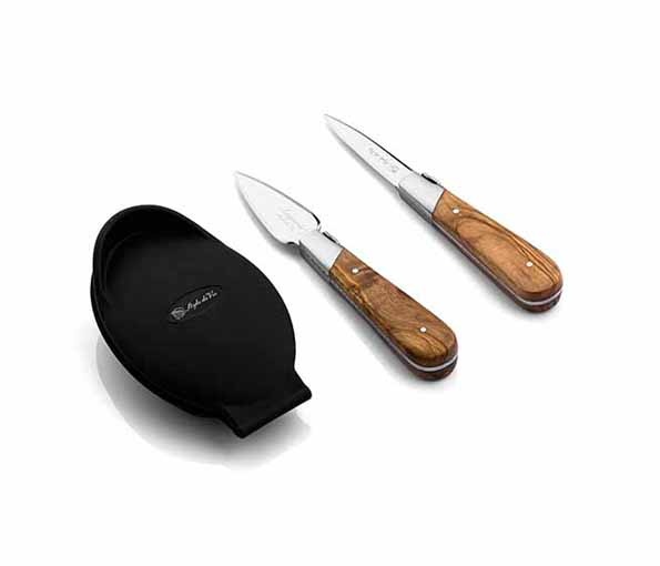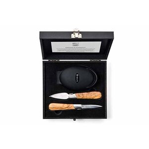 Oestermes eikenhout en siliconen oesterhouder handbeschermer, verpakt in zwart houten luxe-koffertje. Handvat met typisch bijtje-afwerking van Laguiole. Het lemmet is 2,5 mm dik.