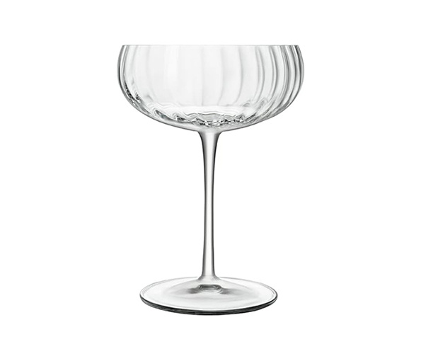 Set 6 champagnecoupen / cocktailcoupen Luigi Bormioli Speakeasies Swing - 30 cl. Afmetingen: 10,7 cm doorsnede x 15,7 cm hoogte. Mooie coupe in helder glas met een optic-effect die je cocktail of champagne een aantrekkelijk tintje geeft. Mooie giftbox.