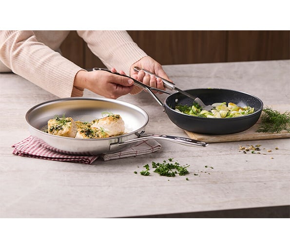 Braadpan / Bakpan Demeyere Silverline 7 - diameter boven 20 cm. 7-lagige pan voor optimale warmtegeleiding op alle kookplaten. Steel in gegoten inox voor minimale warmtegeleiding. Microscopische NanoTouch oppervlaktebewerking om minder aan te kleven.