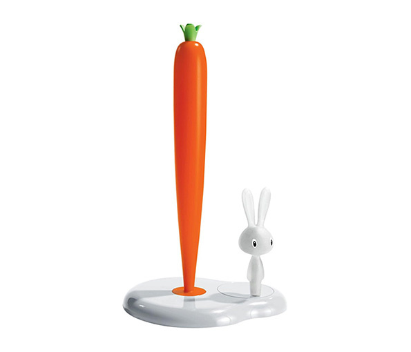 De Alessi keukenrolhouder is gemaakt in de vorm van een oranje wortel met konijntje. De houder is gemaakt van wit kunststof met oranje accenten; het konijntje zorgt ervoor dat de keukenrol wordt tegengehouden.