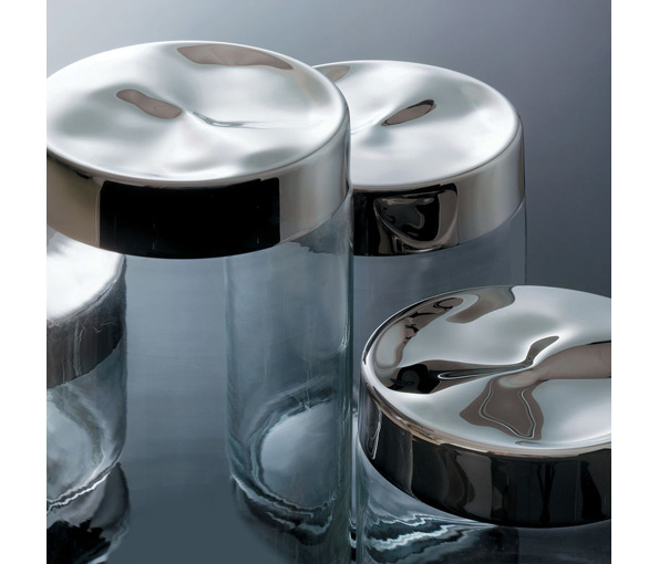 Voorraaddoos / Keuken Box Alessi Julieta 75 cl glas en roestvrij staal. Het deksel is precies uit gedeukt blinkend roestvrij staal. Een ontwerp van de Catalaanse architect en designer Lluis Clotet. PRIJS PER STUK.