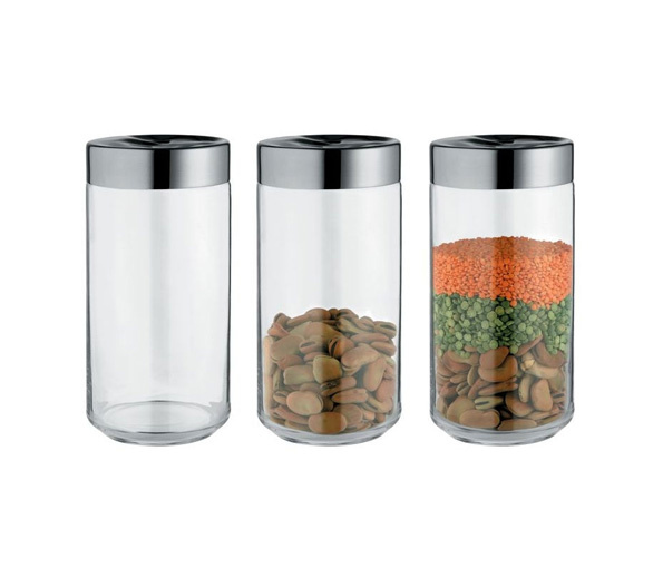 Voorraaddoos / Keuken Box Alessi Julieta 50 cl glas en roestvrij staal. Het deksel is precies uit gedeukt blinkend roestvrij staal. Een ontwerp van de Catalaanse architect en designer Lluis Clotet. PRIJS PER STUK.