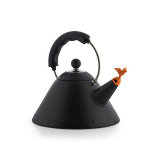 Fluitketel / Waterketel Michael Graves black zwart - Jubileumeditie 40 jaar/ Waterkoker van gekleurd roestvrij staal, zwart. Zwart handvat en oranje vogelvormig fluitje van PA. Magnetische stalen bodem, geschikt voor inductiekoken.