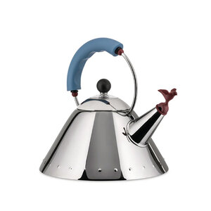 Fluitketel / Waterketel Michael Graves black blauw - Designicoon uit de Alessi-collectie. Waterkoker van gekleurd roestvrij staal, blauw handvat en vogelvormig fluitje van PA. Magnetische stalen bodem, geschikt voor inductiekoken.