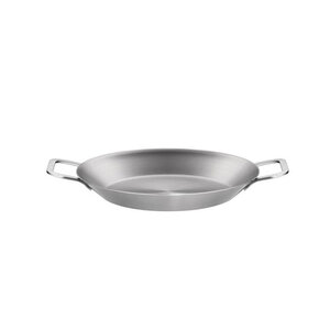 Paellapan Spring 34 cm in mat geborsteld roestvrij staal. Hoogwaardig meerlagig materiaal: aluminium kern 2 tussen lagen roestvrij staal, van rand tot rand, inclusief inductievriendelijke buitenkant. Geschikt voor alle kookplaten, vaatwasmachine en oven