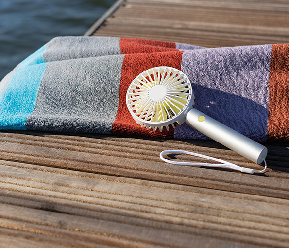 Draagbare ventilator Remember Flow zilver om in de hand te houden of op tafel of bureel te plaatsen. EV03 Geniet op een vlotte manier van deugddoende koelte. Oplaadbaar via USB-aansluiting. Werking tot 7 uur. 3 snelheden.