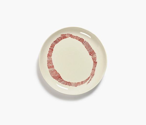 Dit wit bord met rode organische streepjes voegt een vrolijk element toe aan je tafelsetting.
