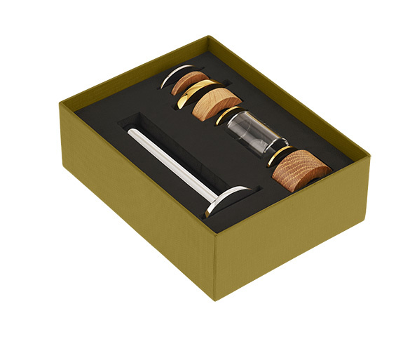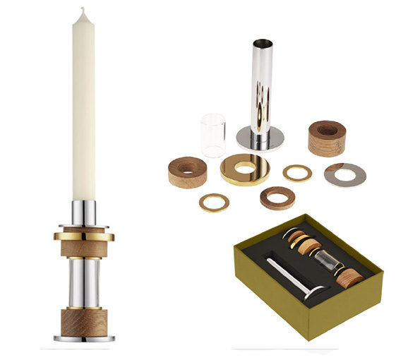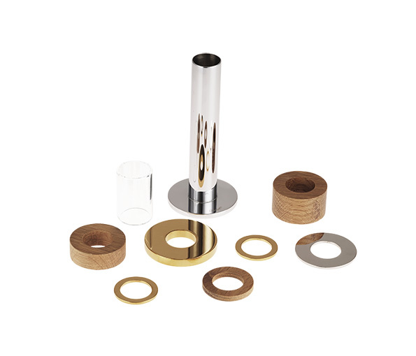 Kandelaar Christofle Myriade midden 12,5 cm h. staal - acryl - hout - verguld. De onderdelen zijn onderling verwisselbaar zodat men verschillende versies kan bekomen.