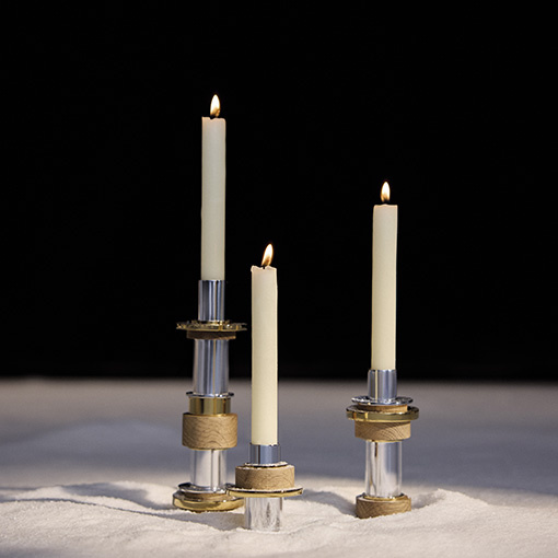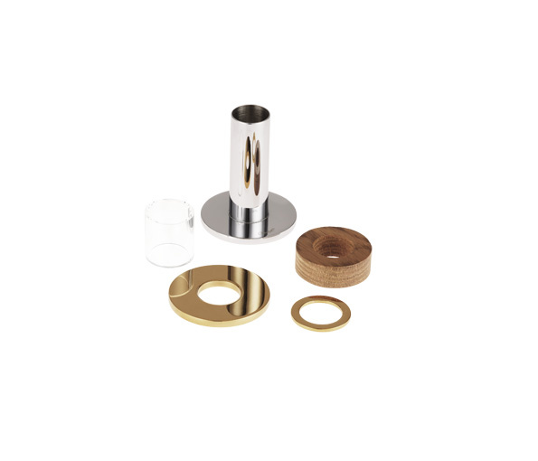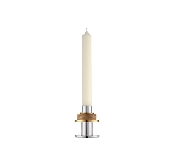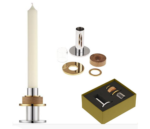 Kandelaar Christofle Myriade midden 12,5 cm h. staal - acryl - hout - verguld. De onderdelen zijn onderling verwisselbaar zodat men verschillende versies kan bekomen.