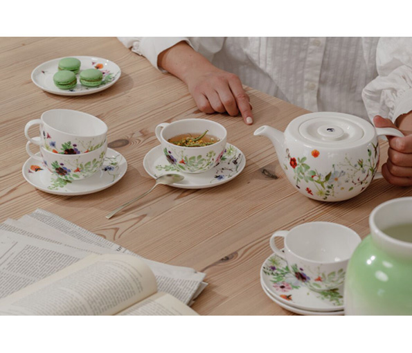 Zo verfrissend als een wandeling in de frisse berglucht wordt het bloemendecor »Grand Air« op een natuurlijke wijze afgebeeld op de Rosenthal-vorm Brillance. De Zwitserse textielontwerpster Regula Stüdli neemt de kijker mee op haar reis door een kruiden- en bloementuin, waar alles groen en in bloei staat.