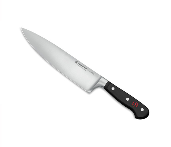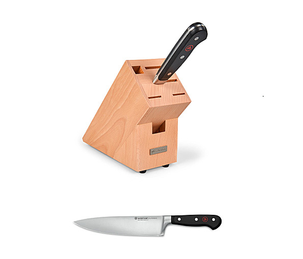 Koksmes of demi-chefmes Wüsthof Dreizack Classic 20 cm (€ 119.00) tijdelijk met GRATIS messenblok (€ 75.00). Het gesmeed mes is in Duits koudgewalst staal met 58 Rockwell hardheid. De messenblok is in beukenhout voor 5 messen, 1 wetstaal en 1 keukenschaar