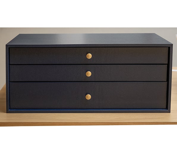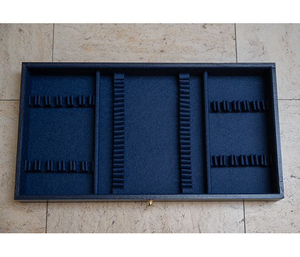 Donkerblauwe lederlook aan buitenzijde en donkerblauwe vilt binnenin de schuiven.
