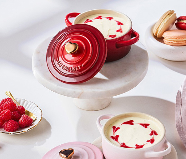 Mini-cocotte Le Creuset ovenvast rood keramiek met verguld hartje-dekselknop. Diameter 10 cm. Inhoud 25 cl. Het aardewerk is thermoresistent van -23°C tot +260°C. Ideaal voor uw favoriete dips, specerijen en hapjes.