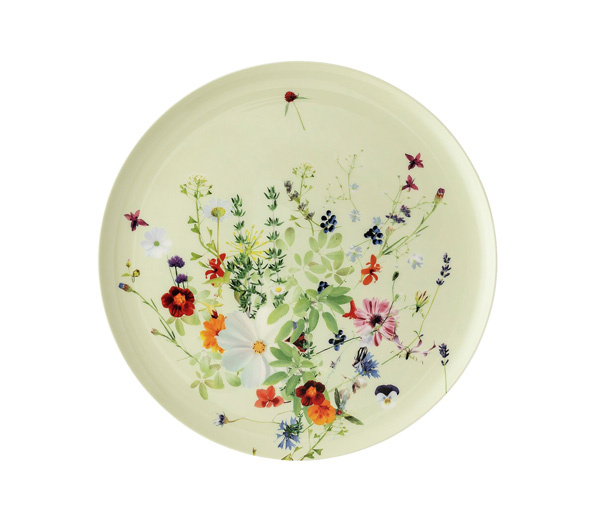 natuur worden gecombineerd tot een veelkleurig bloemenensemble, zweven kruiden en eetbare bloesems in kleine bosjes, losjes verspreid of in cirkels gerangschikt, vrij over de ‘Brillance’-vorm en versmelten ermee tot een sensueel geheel.