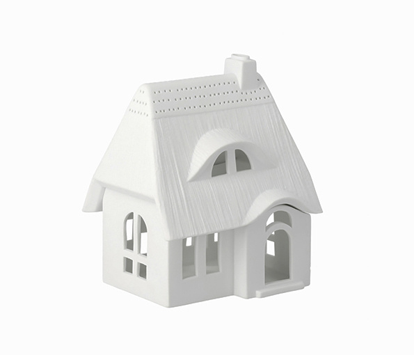 Huisje / Lichthuisje / Sfeerlichtje Räder met rieten dak (afneembaar) h. 16 cm. Vervaardigd in wit biscuit-porselein. Kan dienen om theelichtje in te zetten om sfeer in huis te creëren.