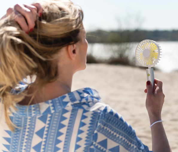 Draagbare ventilator Remember Flow zilver om in de hand te houden of op tafel of bureel te plaatsen. EV03 Geniet op een vlotte manier van deugddoende koelte. Oplaadbaar via USB-aansluiting. Werking tot 7 uur. 3 snelheden.