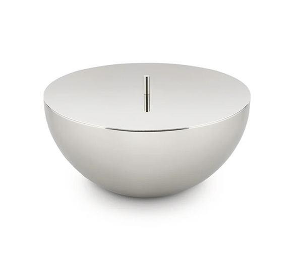 Rocc containter Alessi opbergdoos met deksel midden in rvs 15,5 cm ciam. 8,5 cm h. Design Michael Anastassiades. Kunnen gecombineerd worden met geparfumeerde kaarsen die erin kunnen geplaatst worden.