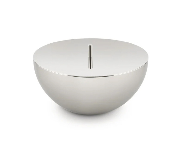 Rocc containter Alessi opbergdoos met deksel midden in rvs 15,5 cm ciam. 8,5 cm h. Design Michael Anastassiades. Kunnen gecombineerd worden met geparfumeerde kaarsen die erin kunnen geplaatst worden.