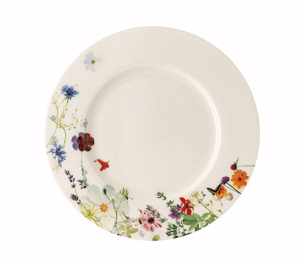 Zo verfrissend als een wandeling in de frisse berglucht wordt het bloemendecor »Grand Air« op een natuurlijke wijze afgebeeld op de Rosenthal-vorm Brillance. De Zwitserse textielontwerpster Regula Stüdli neemt de kijker mee op haar reis door een kruiden- en bloementuin, waar alles groen en in bloei staat.Fijne bloesems groeien hier, samen met aromatische wilde bloemen en kruidige planten, die het sierlijke en verfijnde decor »Grand Air« vormen. Hier vind je eetbare bloemen zoals Oost-Indische kers, madeliefjes en nog veel meer, naast tijm, rozemarijn en lavendel.