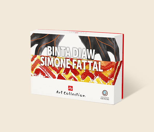 Set 2 espressokopjes Illy Art Collection Genesi I - 2025. Monica Bonvicini, met het kettingmotief, en Shirin Neshatl, vooral bekend om haar werk "Vrouwen van Allah". Op dit artikel wordt geen korting toegestaan.