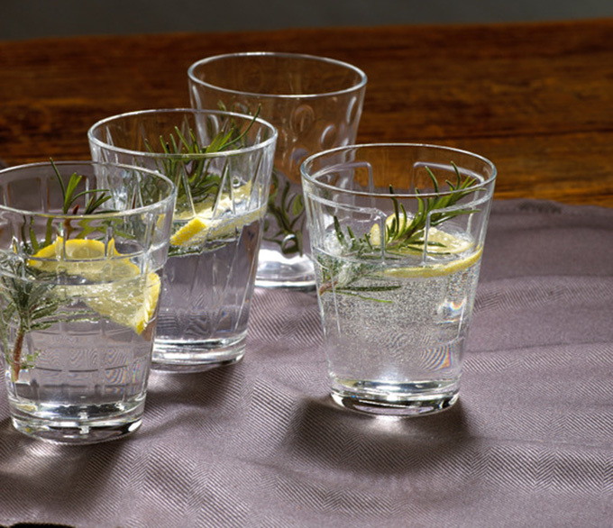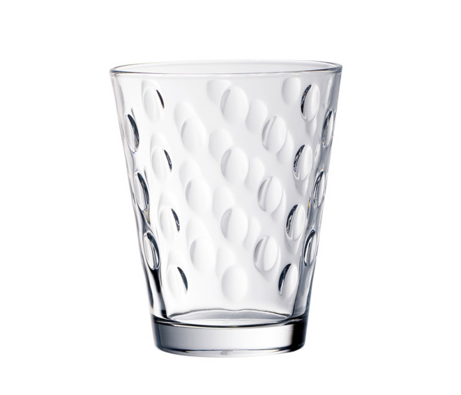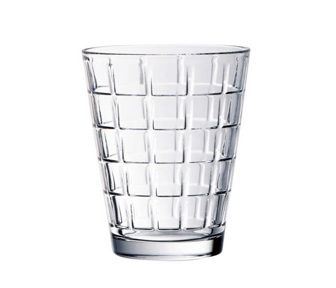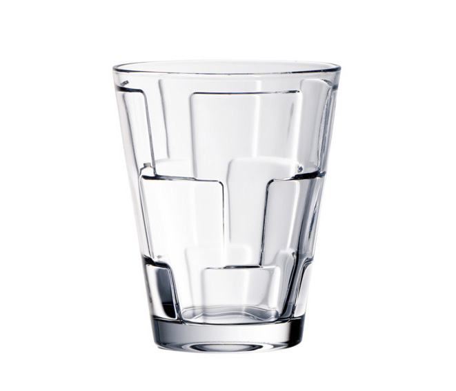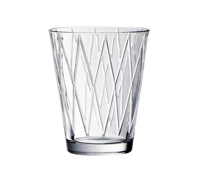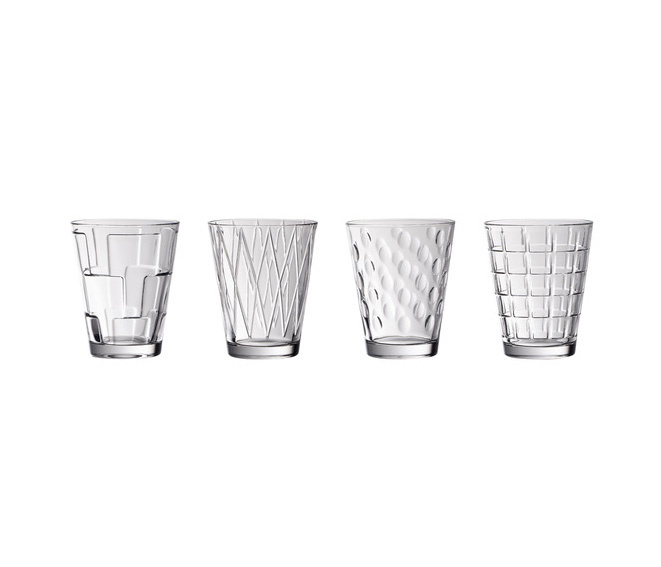 Set 4 conische waterbekers, voor koude dranken. Helder cristallin. Dressed Up. Inhoud: 31 cl. Er zitten 4 glazen in de set en elk glas is versierd met een ander, sterk omlijnd patroon. Vaatwasbestendig. Niet geschikt voor microgolfoven.
