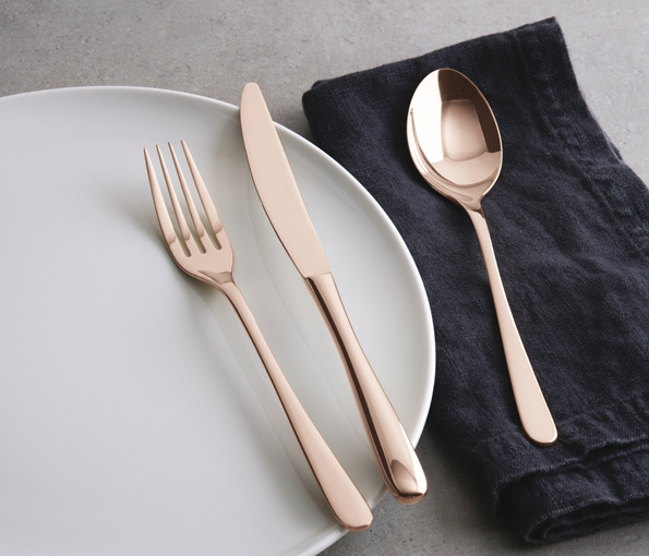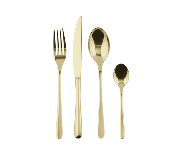 Set 24 delig bestekken Sambonet - glanzend champagnekleur. Is tussen zilver en goudkleur. Bestaande uit 6 tafellepels, tafelvorken, tafelmessen en koffielepels. Dit gecoat bestek is vaatwasbestendig, doch voor messen is handwas aanbevolen.