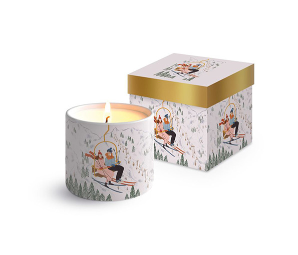 Sfeerlichtje porselein Paperproducts Design - PPD met parafinekaars (zonder geur) 8,5 cm hoog . Zimmertal, Ski. Verpakt in giftbox. Brandduur circa 40u.