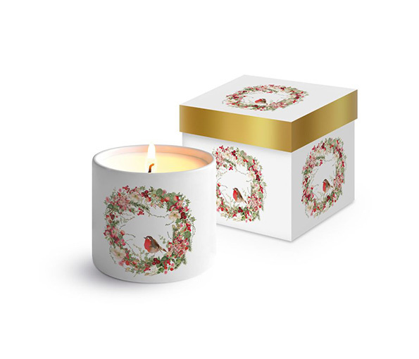 Sfeerlichtje porselein Paperproducts Design - PPD met parafinekaars (zonder geur) - 8,5 cm hoog. Verpakt in giftbox. Roodborstje in Kerstkrans. Brandduur circa 40u.