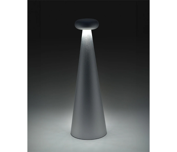 Bedin is een oplaadbare aluminium lamp die de klassieke proporties van deze producten omdraait, volume geeft aan de basis en het verlichtingsgedeelte reduceert dankzij baanbrekende technologische oplossingen. De draaibare lampkop, voorzien van een kroon van ledlampjes, bepaalt de lichtsterkte en kleurtemperatuur (2200-3000 K). De bediening is bijzonder intuïtief: druk simpelweg op de lampkop om hem in te schakelen en draai hem om de instellingen te wijzigen. De draaibare kop heeft een diameter van slechts vijf centimeter.