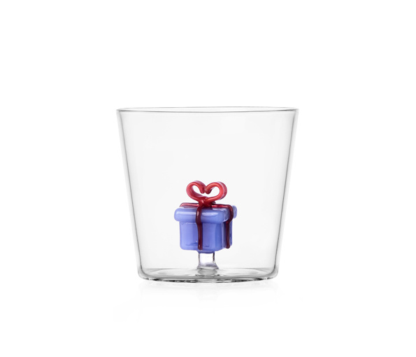 Beker / Waterglas Ichendorf Christmas Tales 35 cl. Lichtblauw geschenk pakje met rode strik. Leuk en creatief glaswerk. Maximum 40 ° C in de vaatwas. (Op foto verkeerdelijk rood pakje met witte strik).