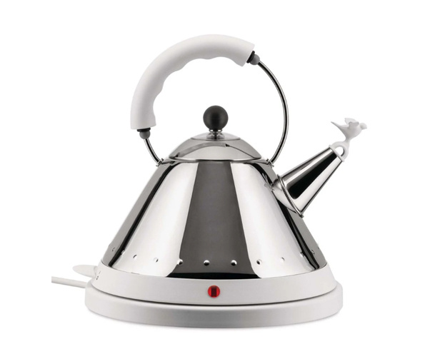De waterkoker Alessi Michael Graves is vervaardigd uit blinkend roestvrij staal en wit kunststof. De handgreep blijft koel tijdens het gebruik. Hij slaat automatisch af wanneer het water kookt. Het vogeltje blijft stil, fluit niet. Inhoud 1,5 liter.
