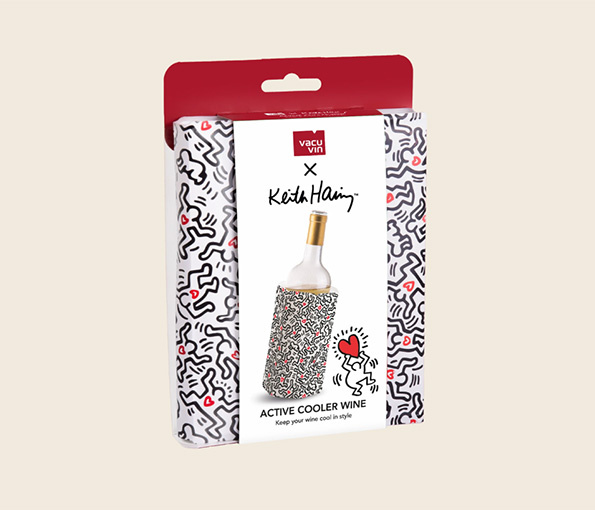Wijnkoeler VacuVin Sleeve x Keith Haring. Waarom gewoon wijn drinken als het ook een feestje kan zijn? Met deze iconische Keith Haring-editie koel je je wijn in een paar minuten – lichtgewicht, flexibel en zonder ijs. Gewoon uit de vriezer halen, om je fles schuiven en klaar.